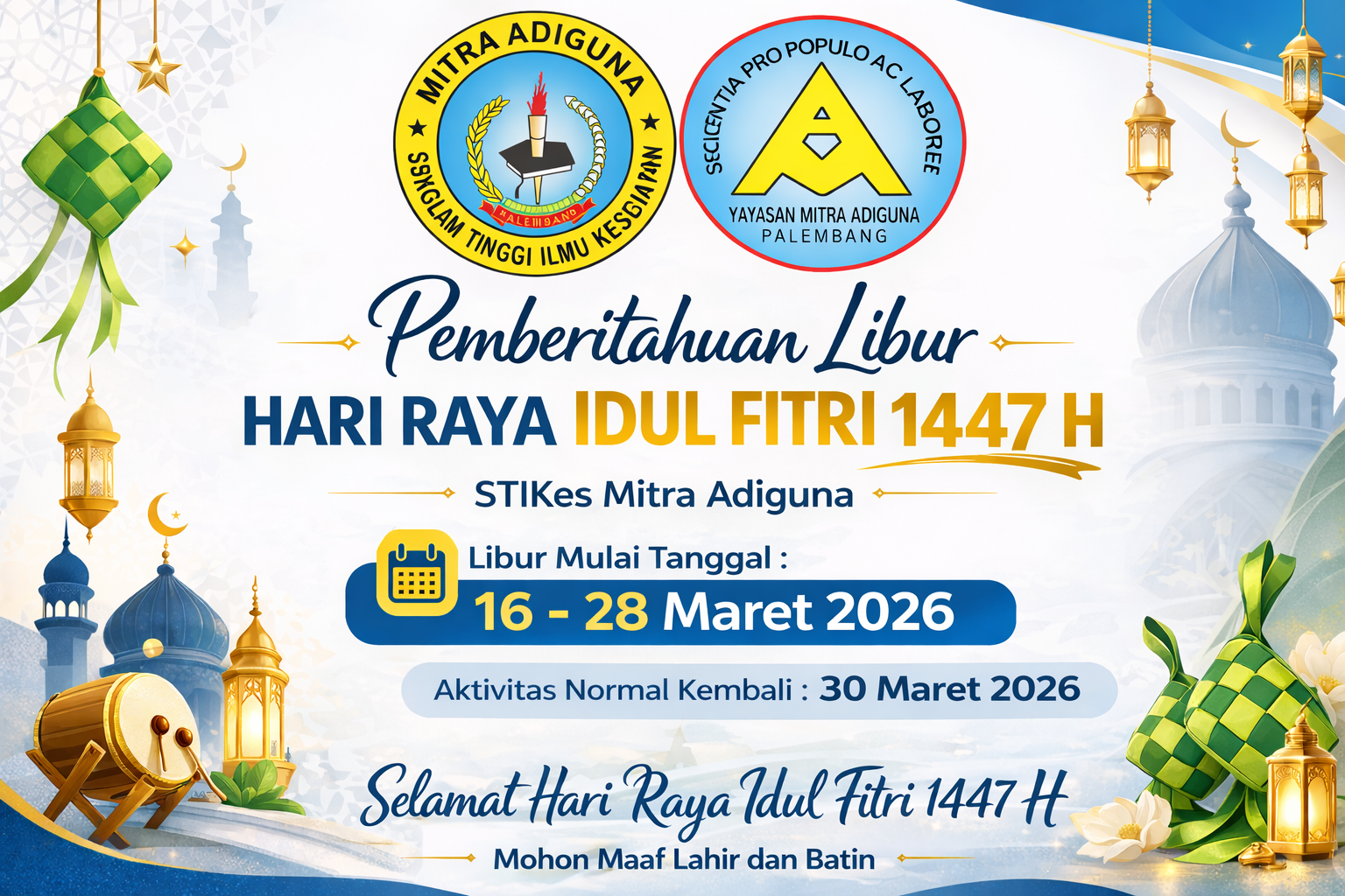 Sehubungan dengan perayaan Hari Raya Idul Fitri 1447 Hijriah, maka seluruh kegiatan akademik dan pelayanan administrasi di STIKes Mitra Adiguna diliburkan mu...